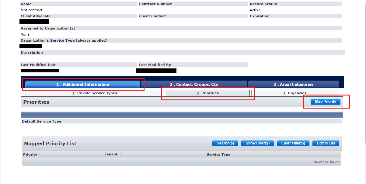 Within the Service Contract select the Additional Information tab, then the Priorities tab.