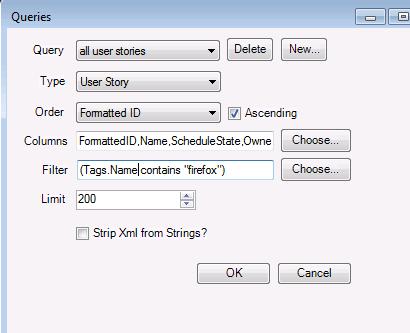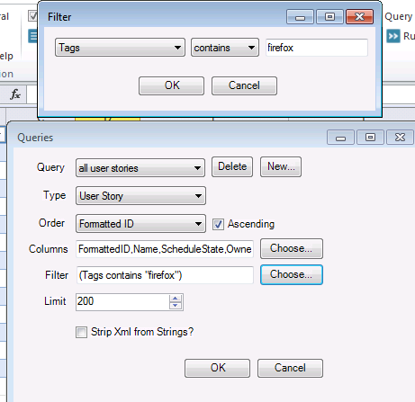 When trying to filter on tags in the Excel Add-In for CA Agile Central using the choose button the resulting query would look like: