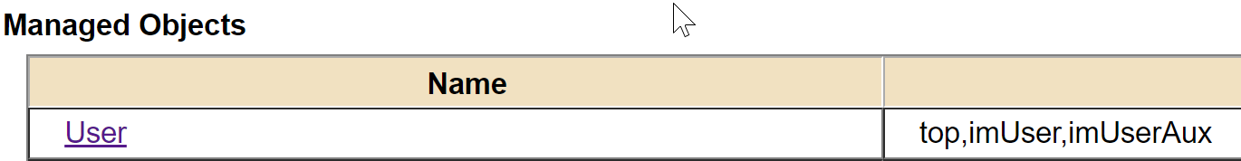 <ImsManagedObject name="User" description="My Users" objectclass="top,imUser" pagesize="0" maxrows="0" objecttype="USER">