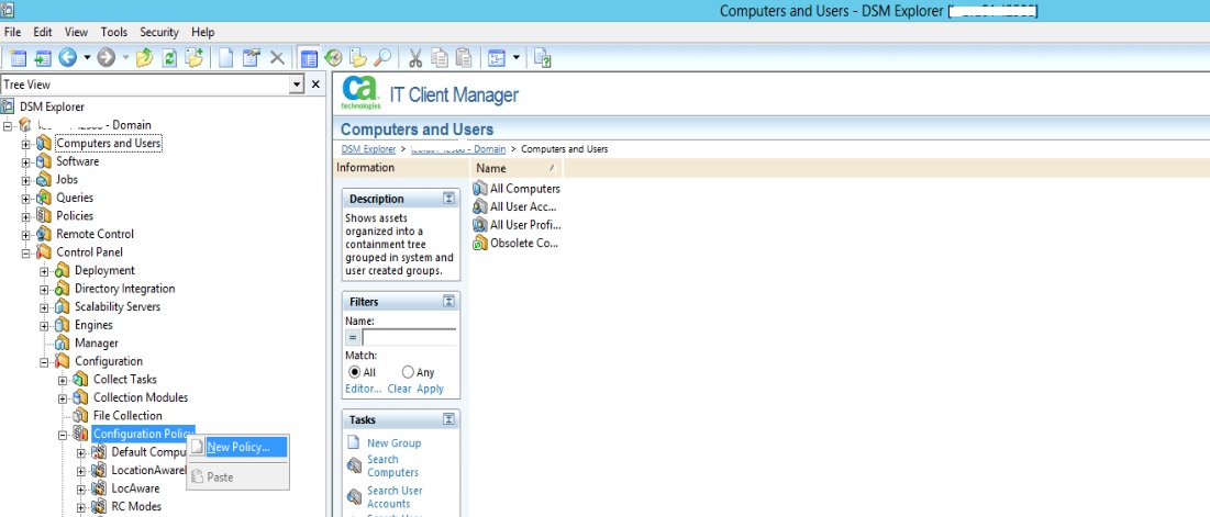 1. In the DSM Explorer, navigate to Control Panel, Configuration, Configuration Policy. Right-click and select 'New Policy'.