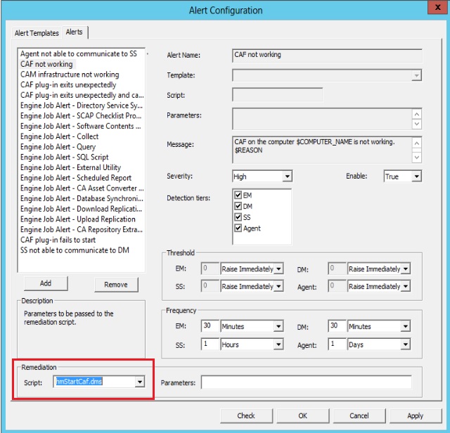 8. For 'Remediation' select the script 'hmStartCaf.dms'. Click OK.