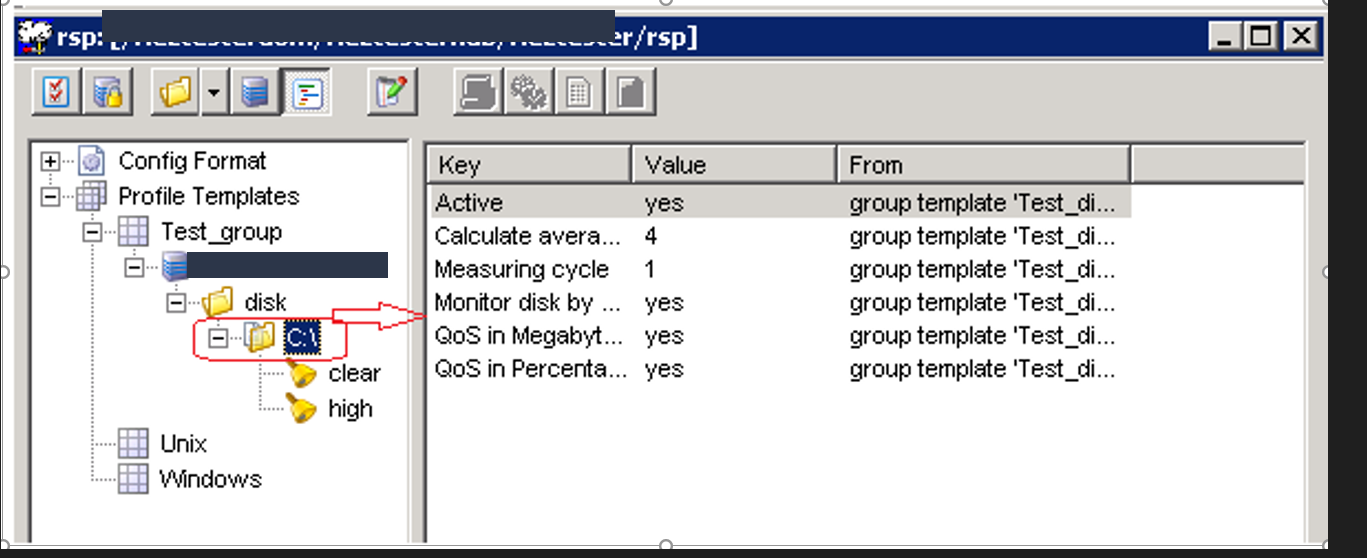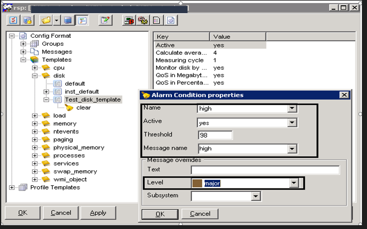 3) Right click here and create a new template named as ‘Test_disk_template’. Select active as ‘Yes’ and do the configuration for Qos and alarms as shown below: