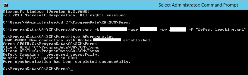 Execute the hformsync command to import the updated “Defect Tracking.xml” file to the Harvest database: