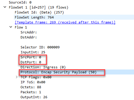 Then Look for flows with "Protocol: Encap Security Payload (50)" like in the screenshot below and you will notice that the SrcPort and DstPort are both 0:
