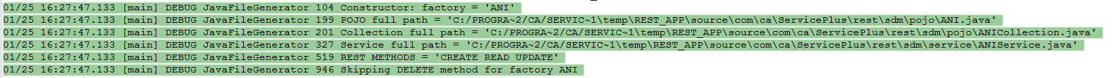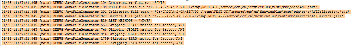 After this issue has been resolved, caisd-rest.war should be approximately 4.5MB in size, and REST calls should function as normal. If you have it enabled, debug-level logging on jrest.log should look like the highlighted lines in the following image: