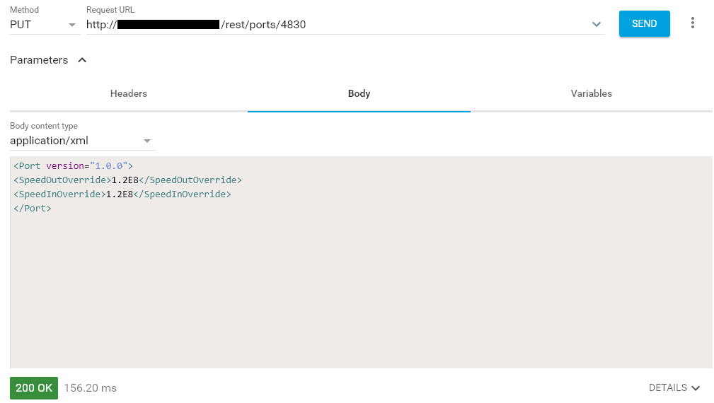 curl --header "Content-Type: application/xml" --request PUT --data '<Port version="1.0.0"><SpeedOutOverride>1.2E8</SpeedOutOverride><SpeedInOverride>1.2E8</SpeedInOverride></Port>' --url http://DAhostname:8581/rest/ports/4830