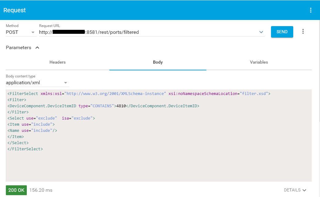 curl --header "Content-Type: application/xml" --request POST --data '<FilterSelect xmlns:xsi="http://www.w3.org/2001/XMLSchema-instance" xsi:noNamespaceSchemaLocation="filter.xsd"><Filter><DeviceComponent.DeviceItemID type="CONTAINS">4810</DeviceComponent.DeviceItemID></Filter><Select use="exclude" isa="exclude"><Item use="include"><Name use="include"/></Item></Select></FilterSelect>' --url http://DAhostname:8581/rest/ports/filtered