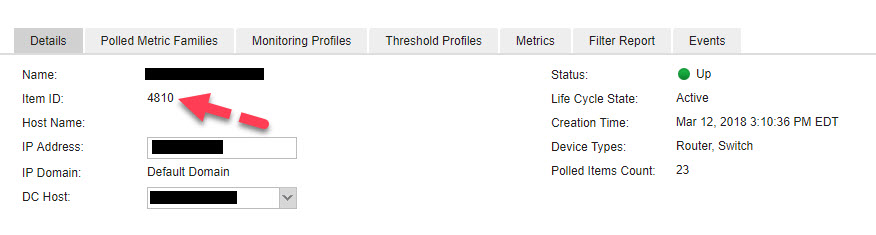 First, you need to obtain the interface ID for the interface you would like to modify and for that, you need to obtain the parent device ID. Let us start in the NetOps Portal GUI under Administration -> Monitored Devices. Find your target device and access the details page where you can find the device's Item ID: