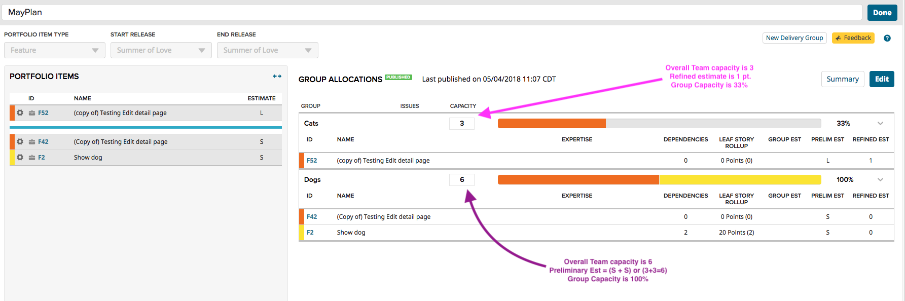 -- The Dogs team has an overall team capacity of 6, F42 and F2 both have a preliminary estimates of 'S', or 3 pts. each = 6 pts. total. The 'group' capacity is therefore 100%.