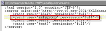 To test LDAP authentication with the binding user "wilyuser", add wilyuser to domains.xml and server.xml so that the user has permission to do things in the Enterprise Manager once logged in.