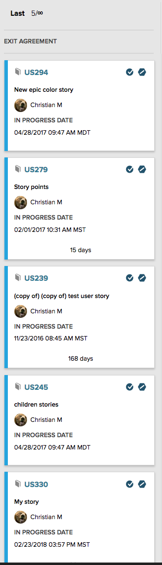 2 of the User Stories were moved to the Last column 3 months ago, and 3 were moved there 2 weeks ago.