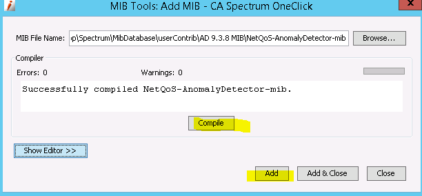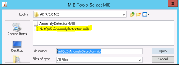 Take this MIB and import to Spectrum MIB Tools - NetQoS-AnomalyDetector-mib. Once imported, Compile and Add the MIB.