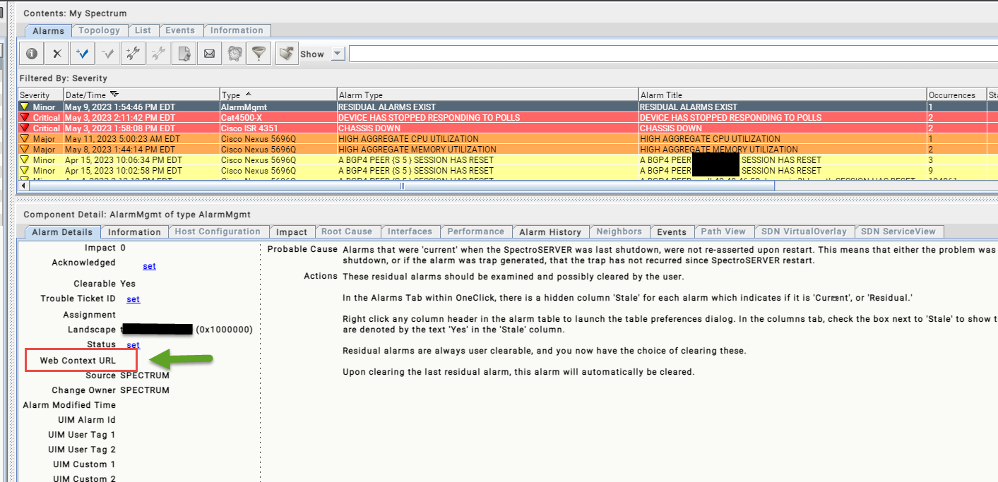 Within the Alarm Details pane of any alarm in the Spectrum OneClick Console there is a field named "Web Context URL".