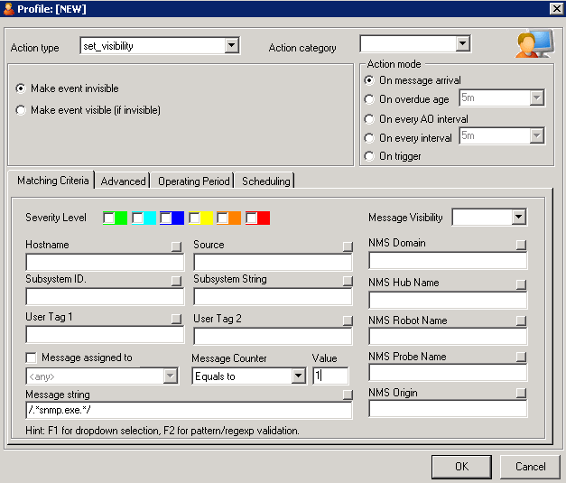 All incoming alarms that match would be set to invisible, hence the 2nd AO profile to set them to visible when the count is >= (gte) 2. This profile would run on an interval basis to ensure they remained visible.
