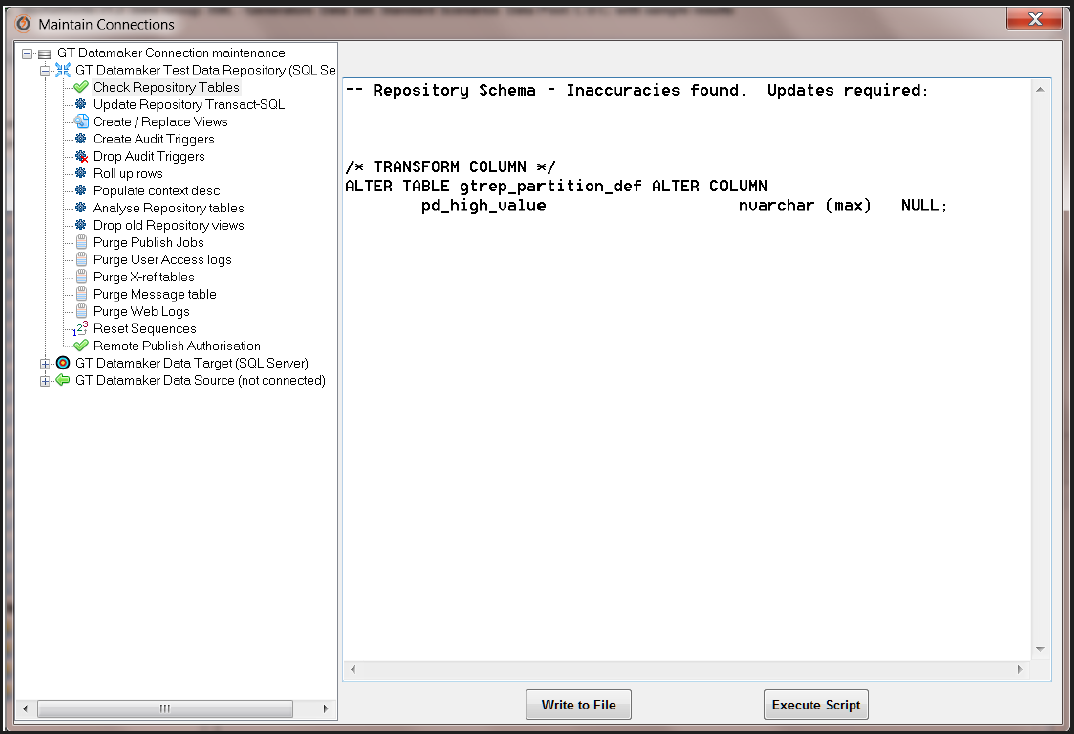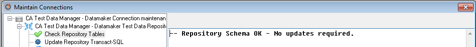 After upgrading your instance of Test Data Manager (TDM), you will need to upgrade the repository tables. Your repository is where TDM, Datamaker, stores the metadata. From inside the 'Maintain Connections' setting window, you will need to 'Check Repository Tables' and 'Update Repository Transact-SQL'. Doing this will perform an analysis of the database tables in your repository and provide a report on these database tables relaying whether or not the repository tables need to be updated. In most cases, no updates will be needed, but if you do not run these tests and maintenance was needed, you can experience unexpected errors while using Datamaker. If updates are required, you will be given a script within the settings window and executing that script will perform the updates.