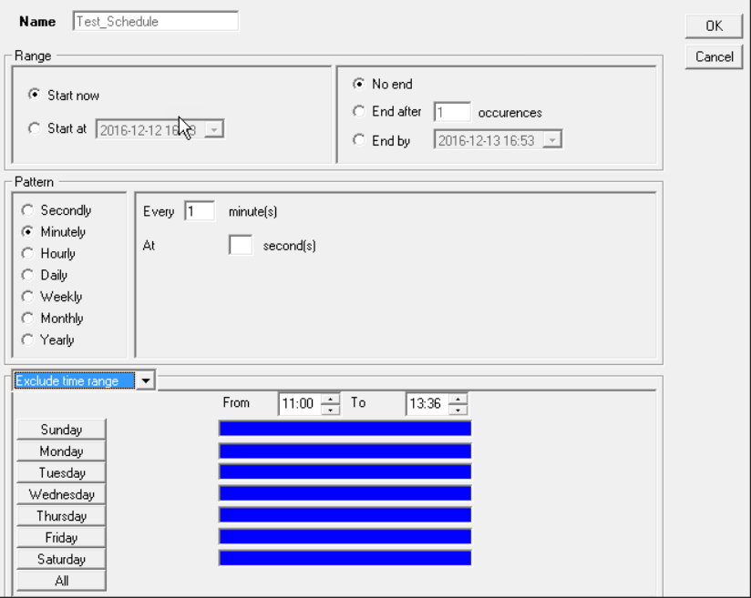 The "Exclude time range" could be more self-explanatory and shows something like From 11:24 to 13:36, but it does not. It just tells you that starting at 11:00 the profile is excluded (it does not say that at 11:25 it starts to work) and then, starting at 13:36 the profile is excluded again.
