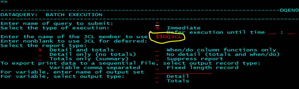 In this example, the JCL member used is $$DQJCL (the system default member). Any other user JCL member could be specified here instead. If the JCL member specified is the default, then a system administrator should be contacted to make the change; otherwise, any user can change their own JCL.