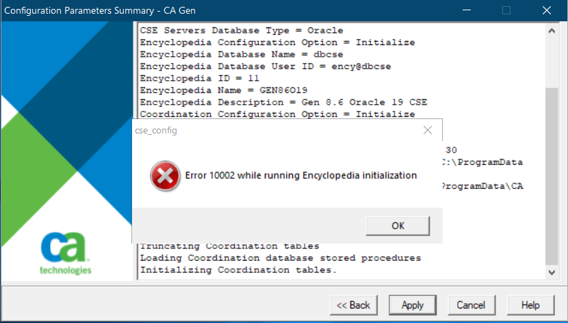 During the CSE configuration steps for initialization of the tables, 32-bit programs are used (initdir.exe and initdb.exe) which will automatically read the Oracle 32-bit ...\network\admin\tnsnames.ora file to get the Oracle NET Service Name definition. If that Service Name is not correctly defined in that file then during the first initialization step "Initializing Coordination tables" the error "Error 10002 while running Encyclopedia initialization" will occur: