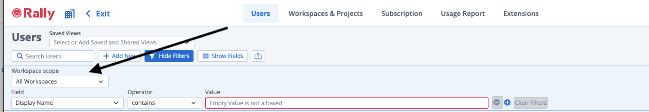Workspace scope is set to Current Workspace but the user isn't in this workspace.