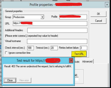 You have configured a profile in url_response probe, and when you click on "Test URL" button, the following error is displayed: