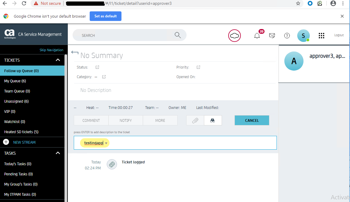 3. In xFlow UI , I do "new a ticket" to log a new ticket. first. In Command Bar I type "testingApp' and then it is able to locate that template automatically :