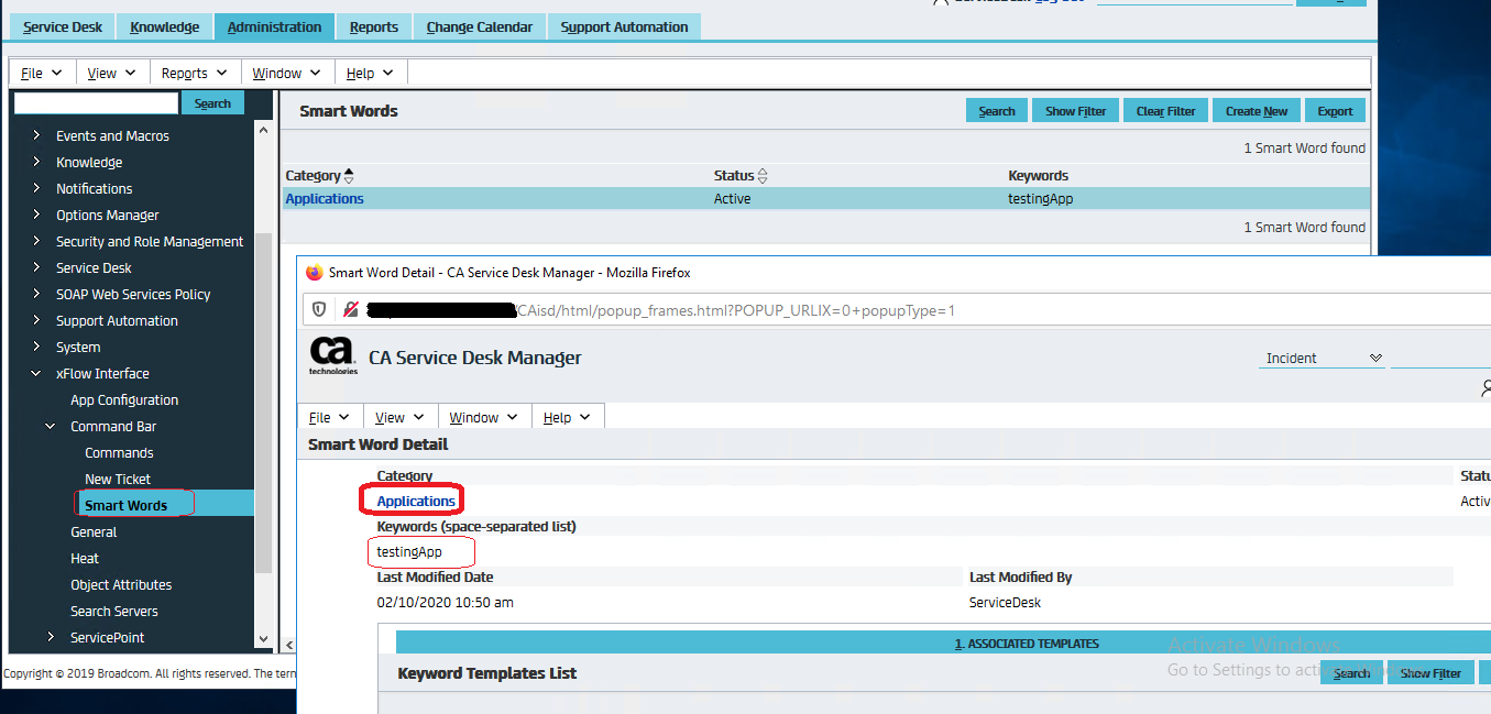 2. Then , In SDM , Administration -> xFlow Interface -> Smart Words -> I created a smart word testingApp for the incident/request's category "Application" :