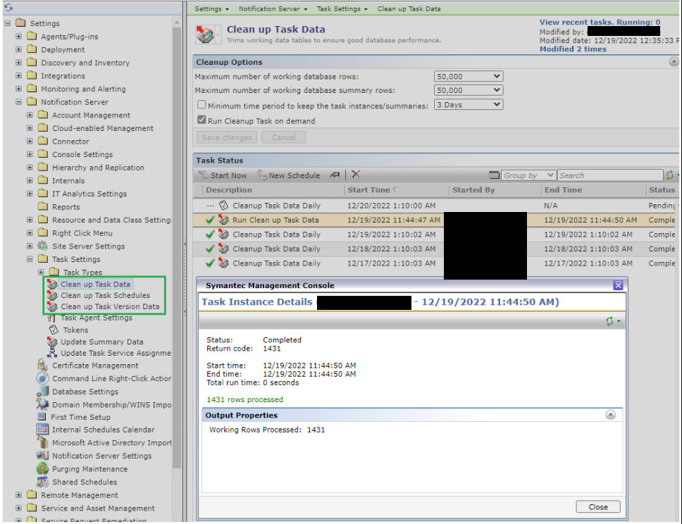 When purging for task instances is started, then there is a set of stored procedures will be executed, like tmDeleteOrpanedTaskInstances, tmDeleteOrpanedTaskInstanceParents, tmDeleteOrpanedTaskOutputPropertyValue, and tmDeleteOrpanedTaskInstanceResultSummaries.