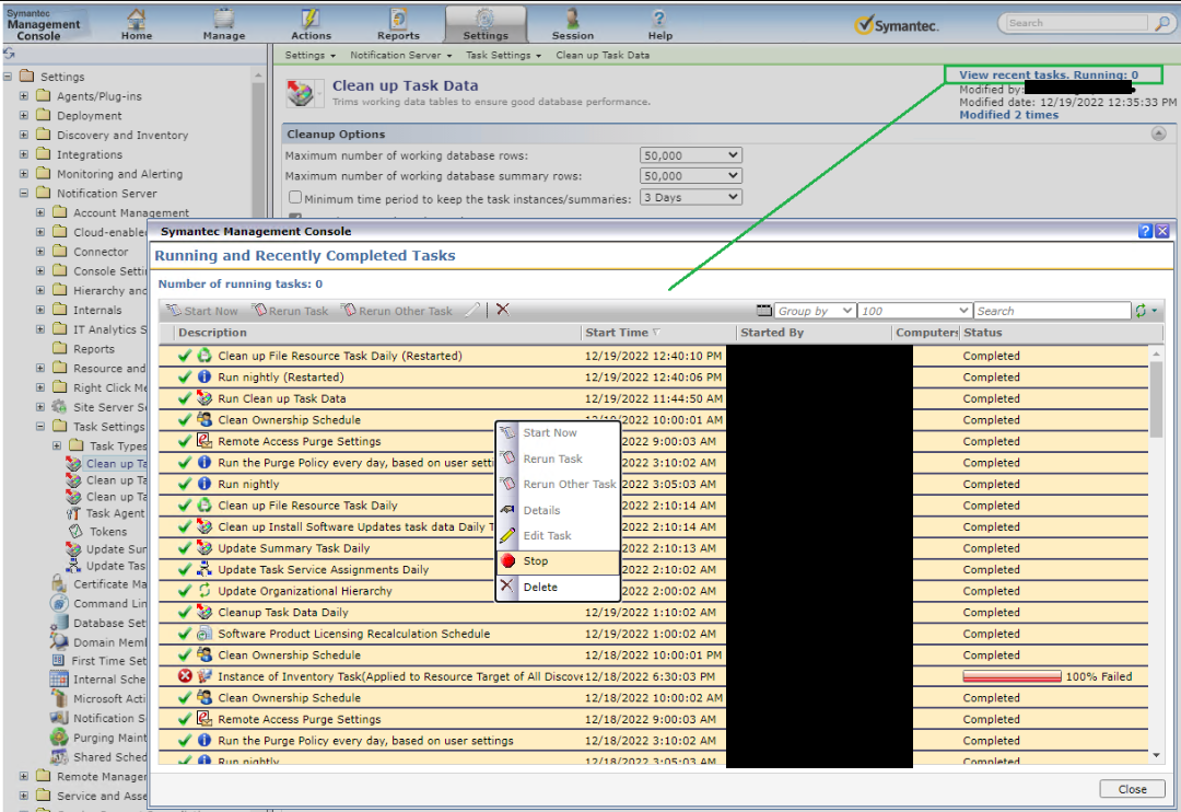 If the Customer is logged in to SMP Console using the default "Symantec Administrators" role, then on any opened task, there is a link to "view recent tasks". From this view, the Customer can multi-select and delete/stop unnecessary task instances