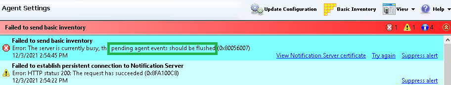 Failed to send basic inventory, COM error: The server is currently busy, the pending agent events should be flushed (0x80056007)