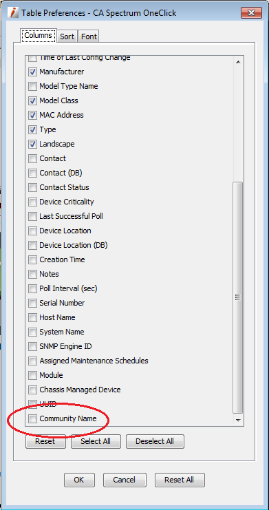 In this example, we are going to add the SNMP Community String attribute as a new column. Out of the box, the SNMP Community String is defined in the column-community-config.xml file located in the $SPECROOT/tomcat/webapps/spectrum/WEB-INF/topo/config directory.