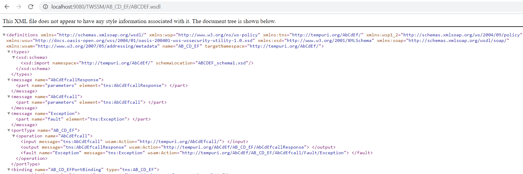 Trying to use http://localhost:9080/TWSSM/AB_CD_EF/AB_CD_EF.wsdl will fail with "Error 404: java.io.FileNotFoundException: SRVE0190E: File not found: /AB_CD_EF/AB_CD_EF.wsdl".