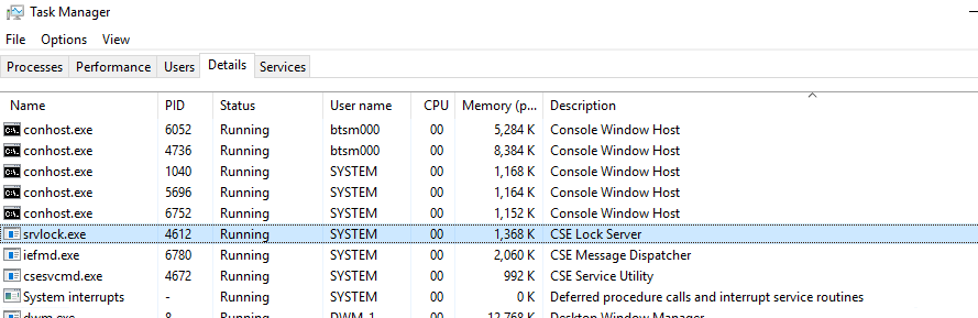 The CSE service CSESvcMD only starts csesvcmd.exe, iefmd.exe and one srv* process srvlock.exe, instead of the usual 7 srv*.exe processes srvcons.exe, srvcoord.exe, srvid.exe, srvlock.exe, srvms.exe, srvuga.exe, srvvc.exe i.e.