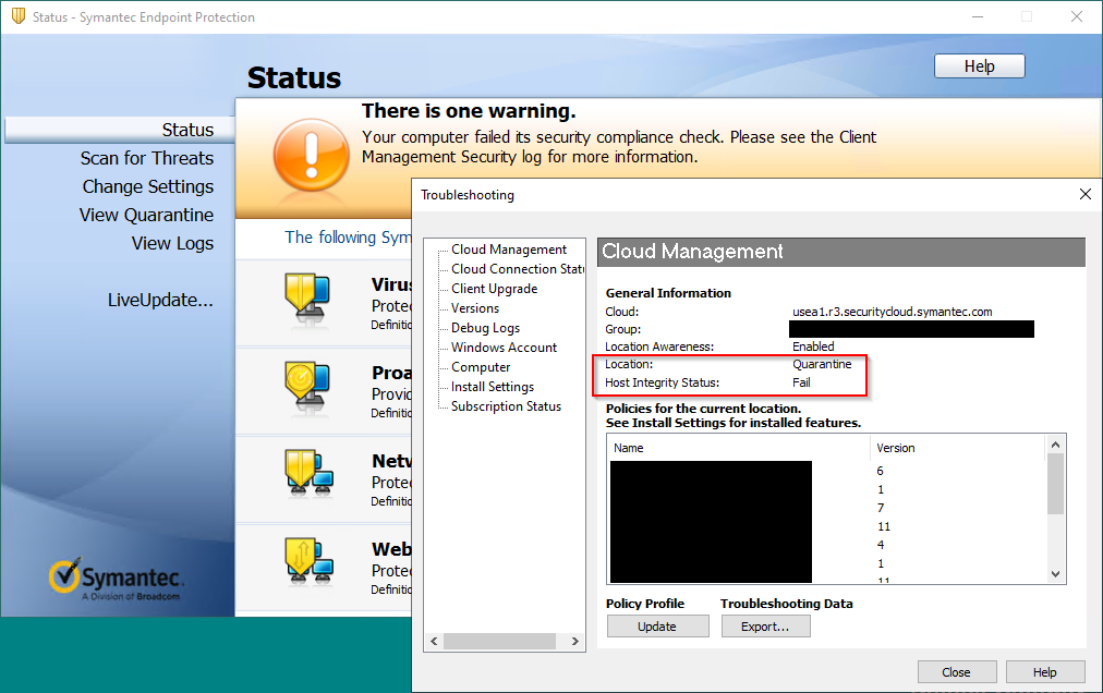 Symantec Endpoint Security (SES) Windows agent is moved to "Quarantine" location by failing Host Integrity (HI) policy. You move this agent to other device group on ICDm console where no HI policy is applied. Agent is moved to the expected device group but still in "Quarantine" location.