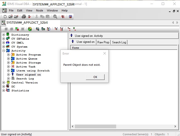 When managing the "User signed on" branch under "Activity" in the DOM, a popup with the message "Parent Object does not exist" appears.