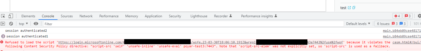Refused to load the script 'https://login.microsoftonline.com/<ID>/wsfed?wa=wsignin1.0&wtrealm=https%3a%2f%2f<hostname>%3a7443%2fusm%2fwpf&wctx=%2fusm%2fwpf%3fNode%3dicguinode.buiticketsstatus%26b2b%3djson-html%26eiamArtifact%3dUserSession%3bVersion-1.0%3bdd623ec33cb797fc9d63c0b568f40b99-64257129-a79aa20-4b%26callback%3dng_jsonp_callback_1&id=passive&wct=2023-03-30T18:06:15.289Z&wreply=https%3a%2f%2fXXXXXXX%3a7443%2fusm%2fwpf' because it violates the following Content Security Policy directive: "script-src 'self' 'unsafe-inline' 'unsafe-eval' ". Note that 'script-src-elem' was not explicitly set, so 'script-src' is used as a fallback.