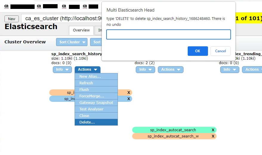 Index removal prior to running an index rebuild may be necessary if the indexes are not refreshing. A possible cause is that there are multiple indices listed in the ElasticSearch Head plugin.