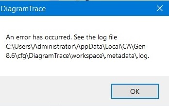 An error has occurred. See the log file C:\Users\UserID\AppData\Local\CA\Gen 8.6\cfg\DiagramTrace\workspace\.metadata\.log