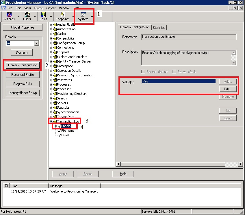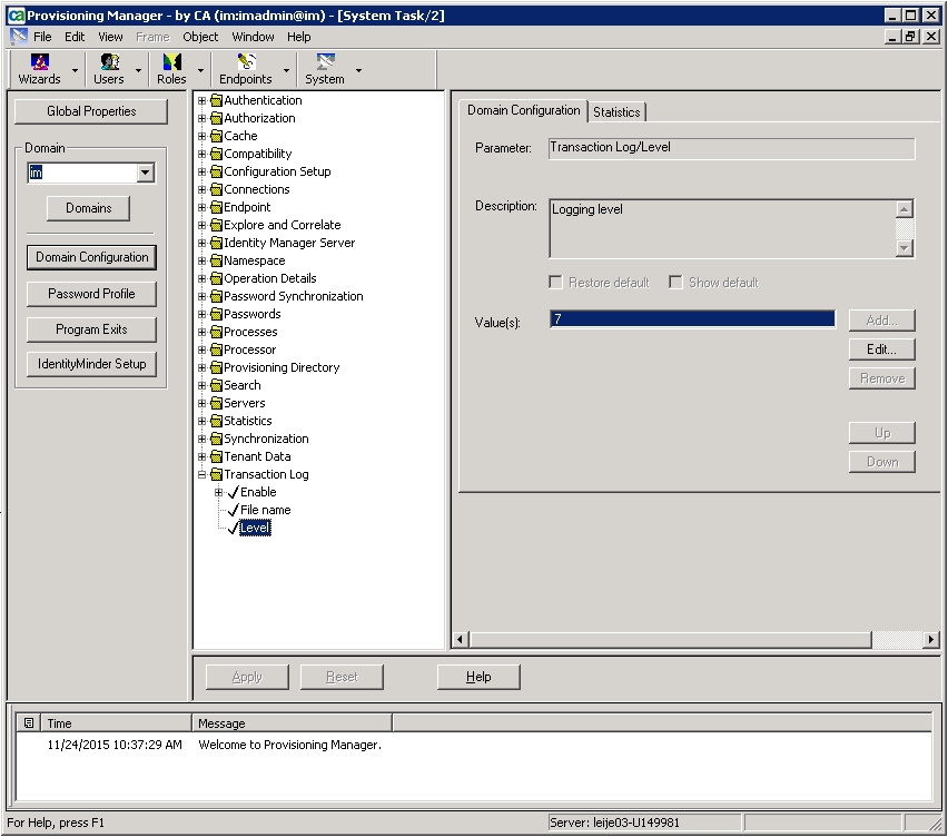 The provisioning server log level controls several different logs including the etatrans, etanotify, sa and satrans logs. The level is adjusted in the Provisioning Manager GUI. The logs are enabled by default, the enable/disable option is located under System > Domain Configuration > Transaction Log > Enable