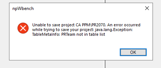 Unable to save project CA PPM\XXXXXX. An error occurred while trying to save your project: java.lang.Exception: TableMetaInfo: PRTeam not in table list