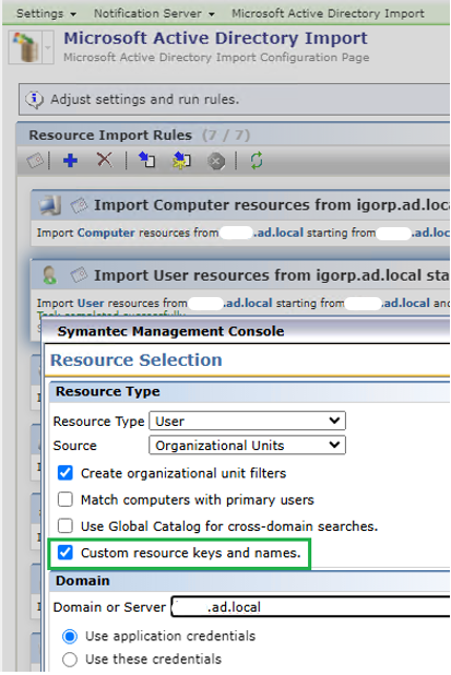 For this purpose, after applying point fix “SMA_SMP_8_7_2_PF_v8.zip” (or later) or “SMA_SMP_8_7_3_PF_v2.zip” (or later), all existing Local AD Import rules and Azure AD import rules have new “Custom resource keys and names” option auto enabled for each of the AD Import Rules (under Settings>All Settings>Notification Server>Microsoft Active Directory Import OR Actions>Discover>Import Microsoft Active Directory):