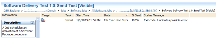 Here's what you'll see in DSM Explorer, showing the job failed with "Exit code 1 indicates possible error":