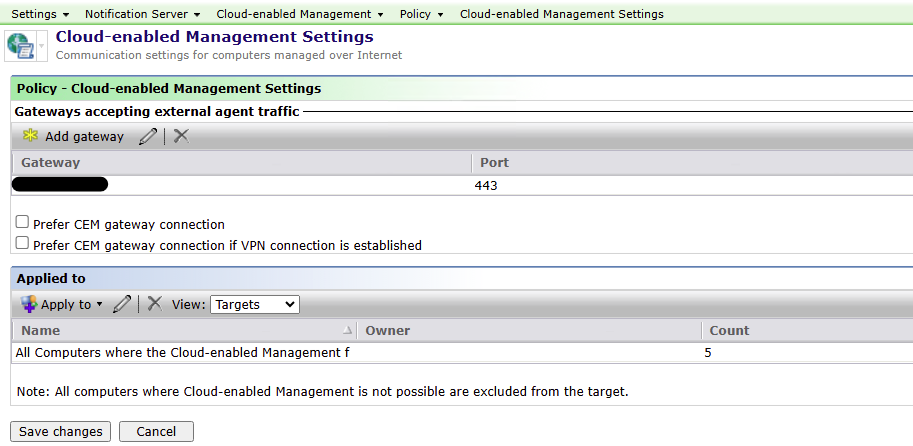 The Cloud-enabled Management Settings policy was checked and 'Prefer CEM gateway connection' options are not checked/enabled: