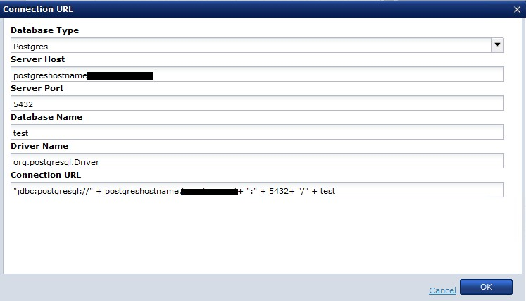NOTE: When ‘Postgres’ is selected in the Connection Wizard, by default the URL is generated with the following: “jdbc:”+ null+”://” . This needs to be changed to “jdbc:postgresql://”.