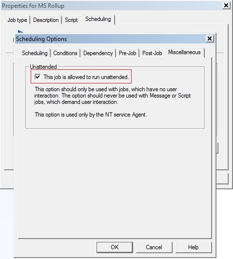 3- Click on Miscellaneous tab and check the option "This job is allowed to run unattended".