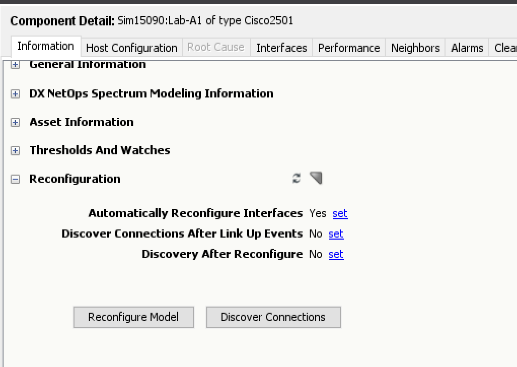 DeviceDiscAfterReconfig (0x11d27) - Determines if SPECTRUM should update its knowledge of connections off a device's interfaces after a reconfiguration occurs. If "Discovery After Reconfigure" is set to Yes/True, it will trigger device connectivity mapping after the device model is reconfigured. Device discovery will read information from the IP MIB, Bridge MIB, and in some instances, vendor specific mibs such as the Cisco Discovery Protocol MIB. Default value "No/False".