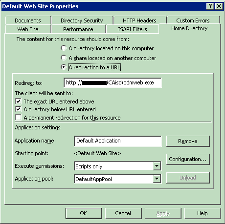 - In the Redirection URL field enter http://<example Service Desk servername>/CAisd/pdmweb.exe