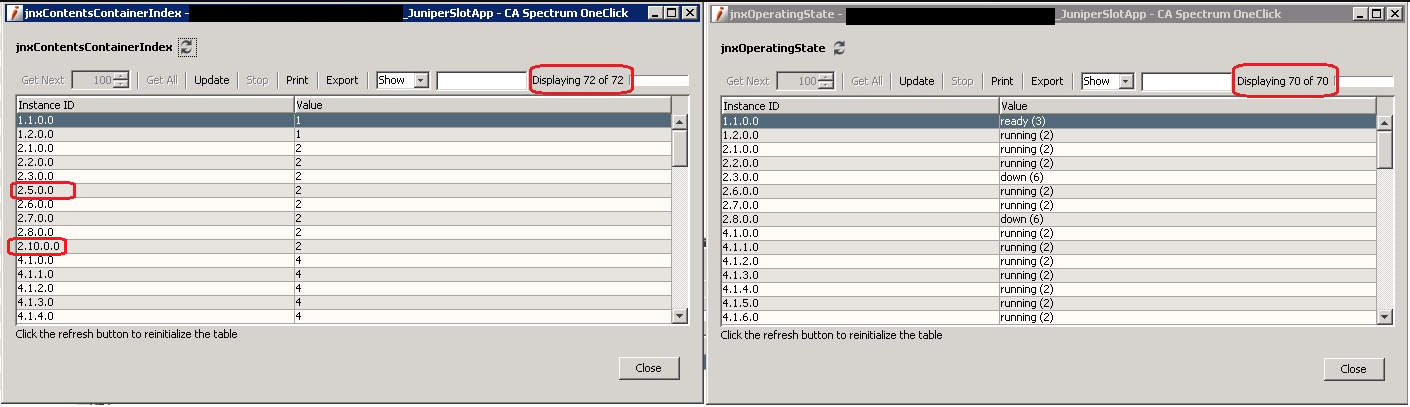 Notice there are 72 values for the jnxContentsContainerIndex attribute but only 70 values for the jnxOperatingState attribute. Instance ID's 2.5.0.0 and 2.10.0.0 are missing from the jnxOperatingState attribute. These two tables should contain the same number of values with the same instance ID's.