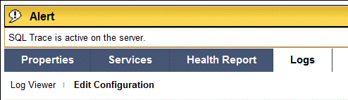 11. Because you set the Priority of the Category to All, a yellow Alert message will appear on the Logs Configuration page. This serves as a reminder to disable the Action Trace later