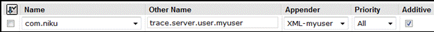 6. Edit the newly-created 'XML - copy' Appender line item for a specific user (myuser) - File name = ../logs/trace_myuser.xml > Click 'SAVE' button located at the top or bottom of the page