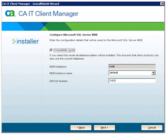 Select "Compatibility Mode" if required. This action lays down legacy tables in to the MDB for backward compatibility with other CA products.